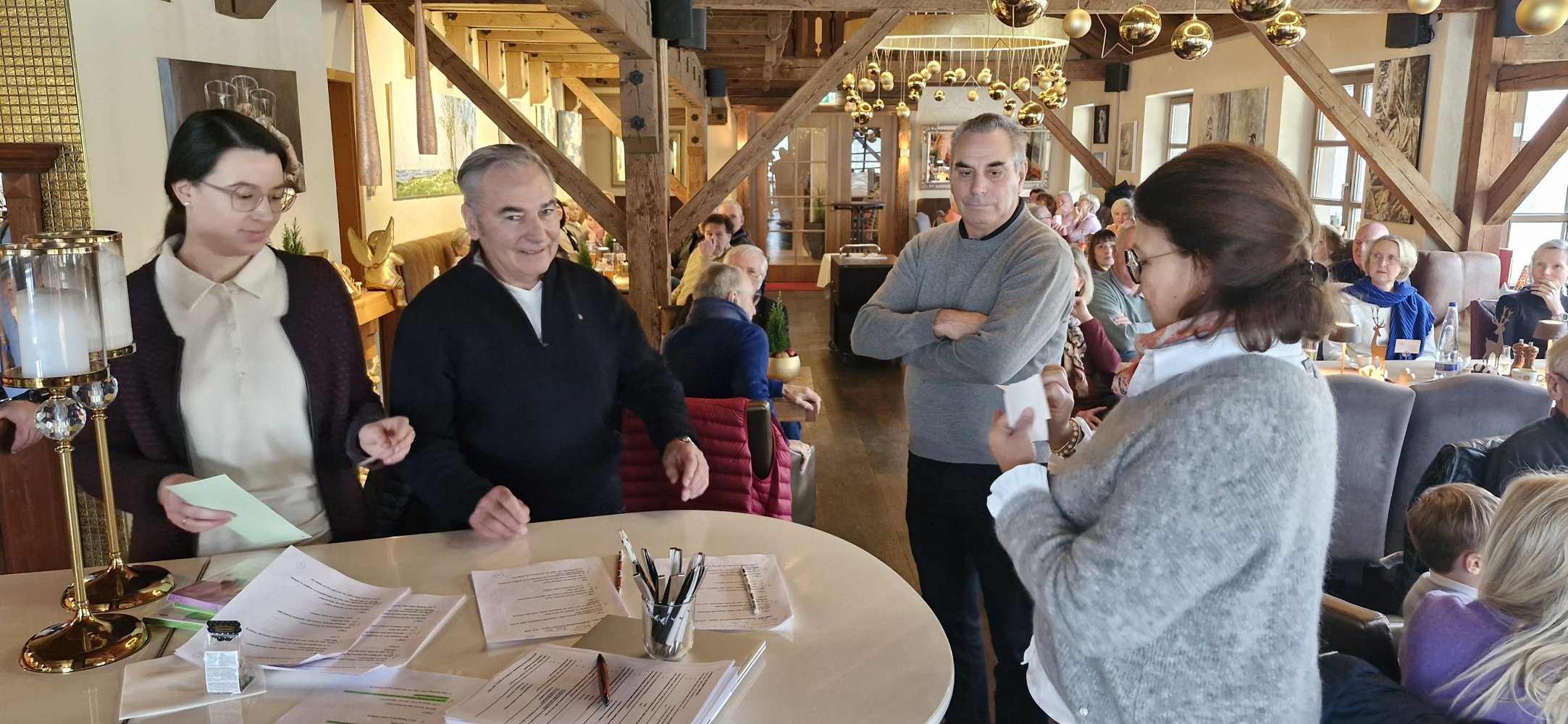Statt der klassischen Weihnachtsfeier im oft hektischen Dezember hatte der Vorstand in diesem Jahr zu einem gemütlichen Neujahrsempfang am 18. Januar ins Morattina eingeladen – eine Idee, die bei den Mitgliedern bestens ankam. Über 70 Clubmitglieder folgten der Einladung und genossen in entspannter Runde ein zünftiges Weißwurstfrühstück. Endlich war wieder Zeit für einen ausgiebigen Ratsch, für Neuigkeiten aus der (gefühlt endlosen) Winterpause und für viele herzliche Begegnungen mit alten Bekannten und neuen Gesichtern. Unsere beiden Organisatorinnen, Vorständin Anna von Werthern-Kuhn und Alexa Stuhler, sorgten zusätzlich für graue Zellen in Bewegung: In Teams wurde das Regelwissen getestet – mit überraschend ehrgeizigem Einsatz. Sowohl um Platz 3 als auch um Platz 1 musste ein Stechen entscheiden. Das konnte Hans Stöhr ganz knapp für sich und sein Team verbuchen.
